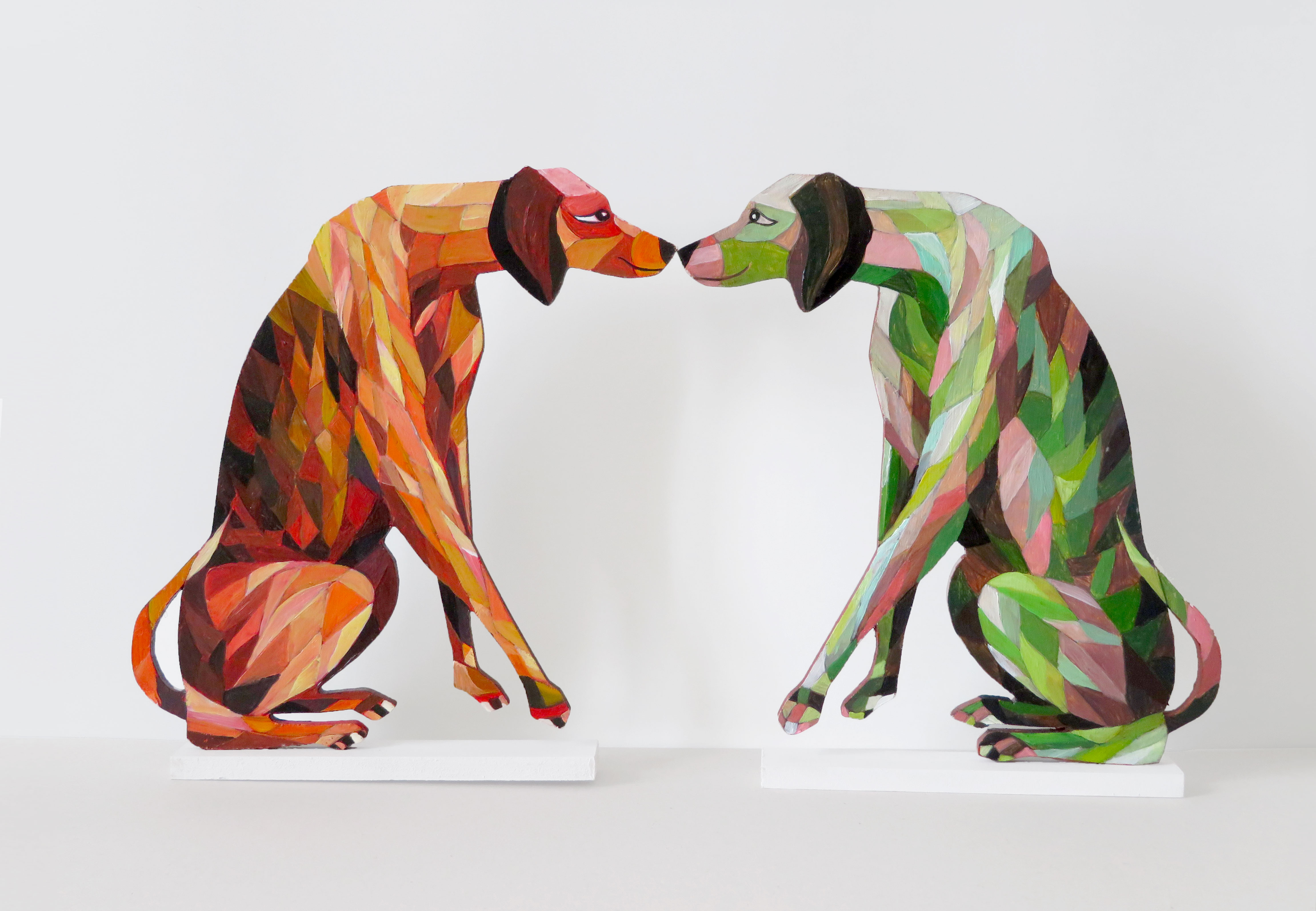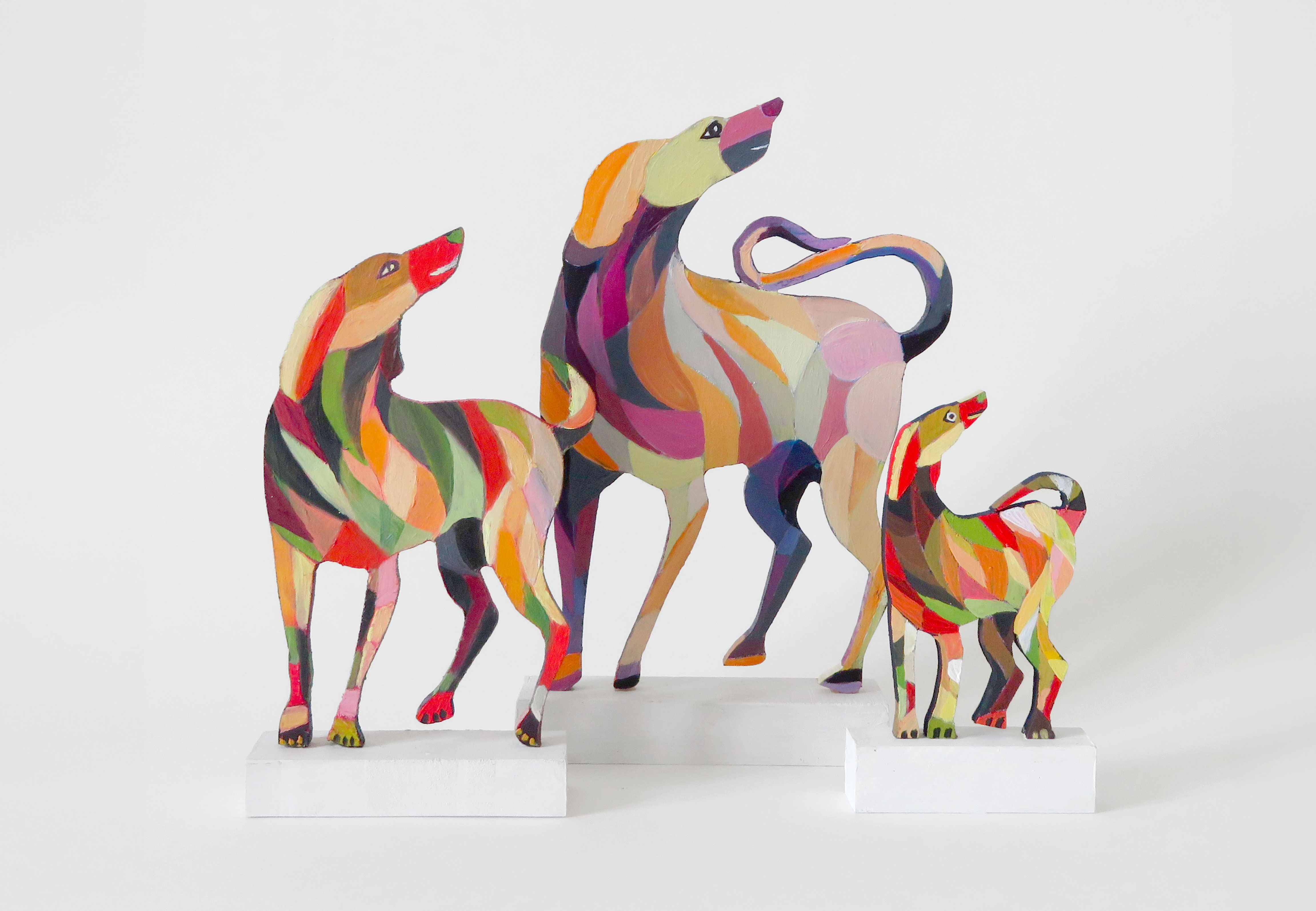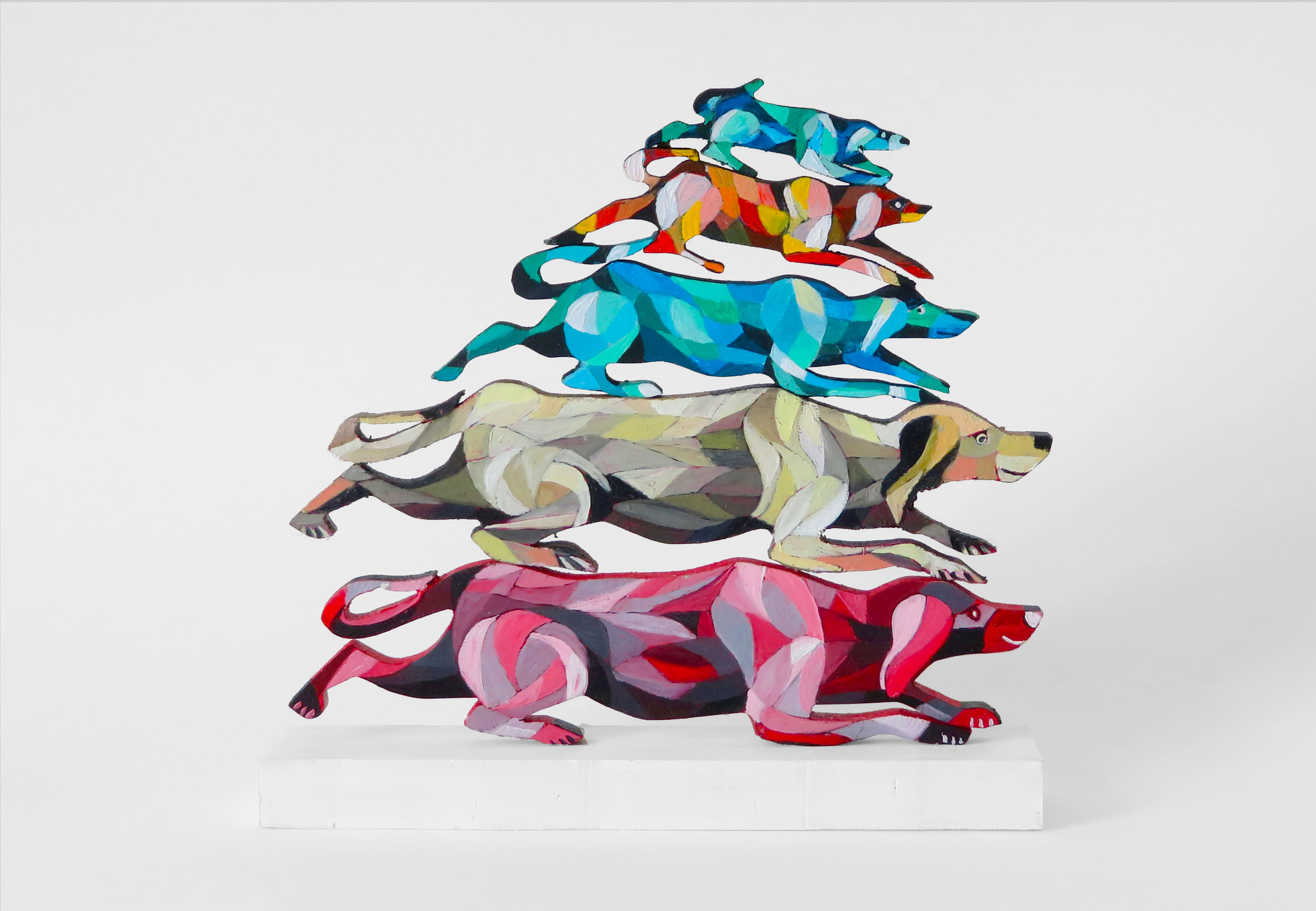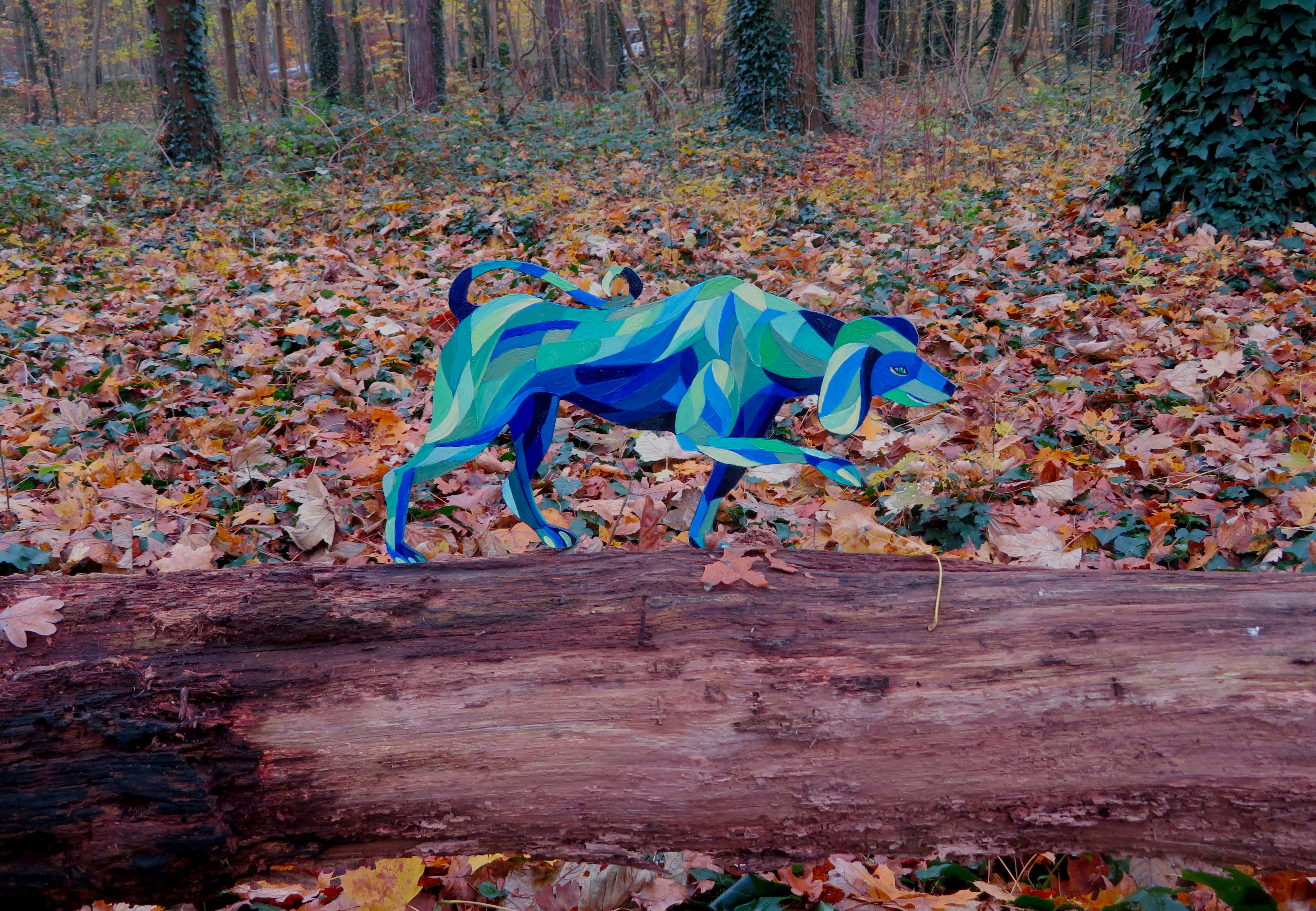 Les chiens à bois d’Alain Saey sont des trésors de vie. Ils courent sur les murs, s’arrêtent, écoutent, attendent, s’ennuient, patientent, s’élancent enfin, s’amusent à deux, boudent, se redressent, s’épaulent. Leurs dos à facette miroitent, dans des gammes de rouge, de bleu, de violacé.