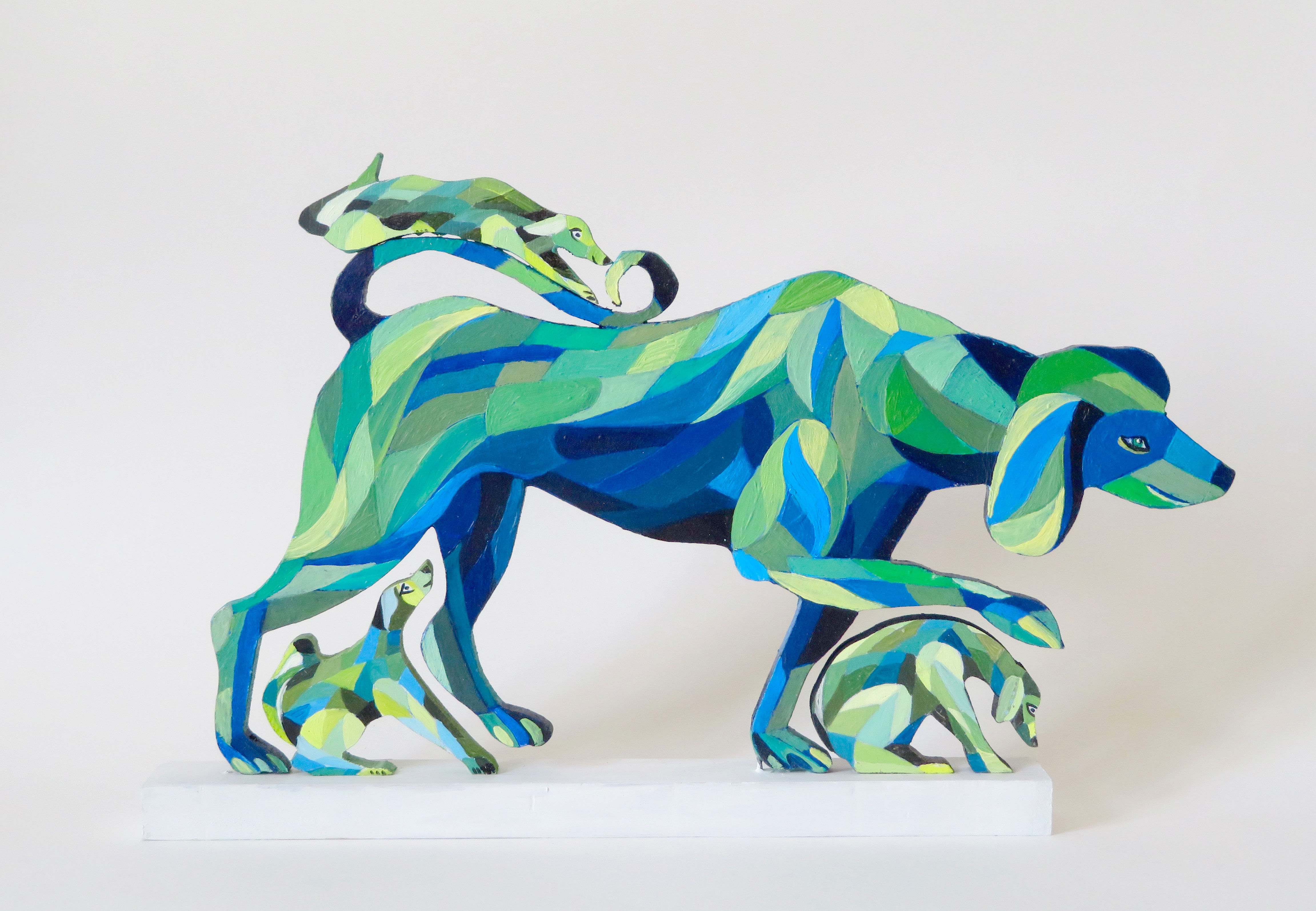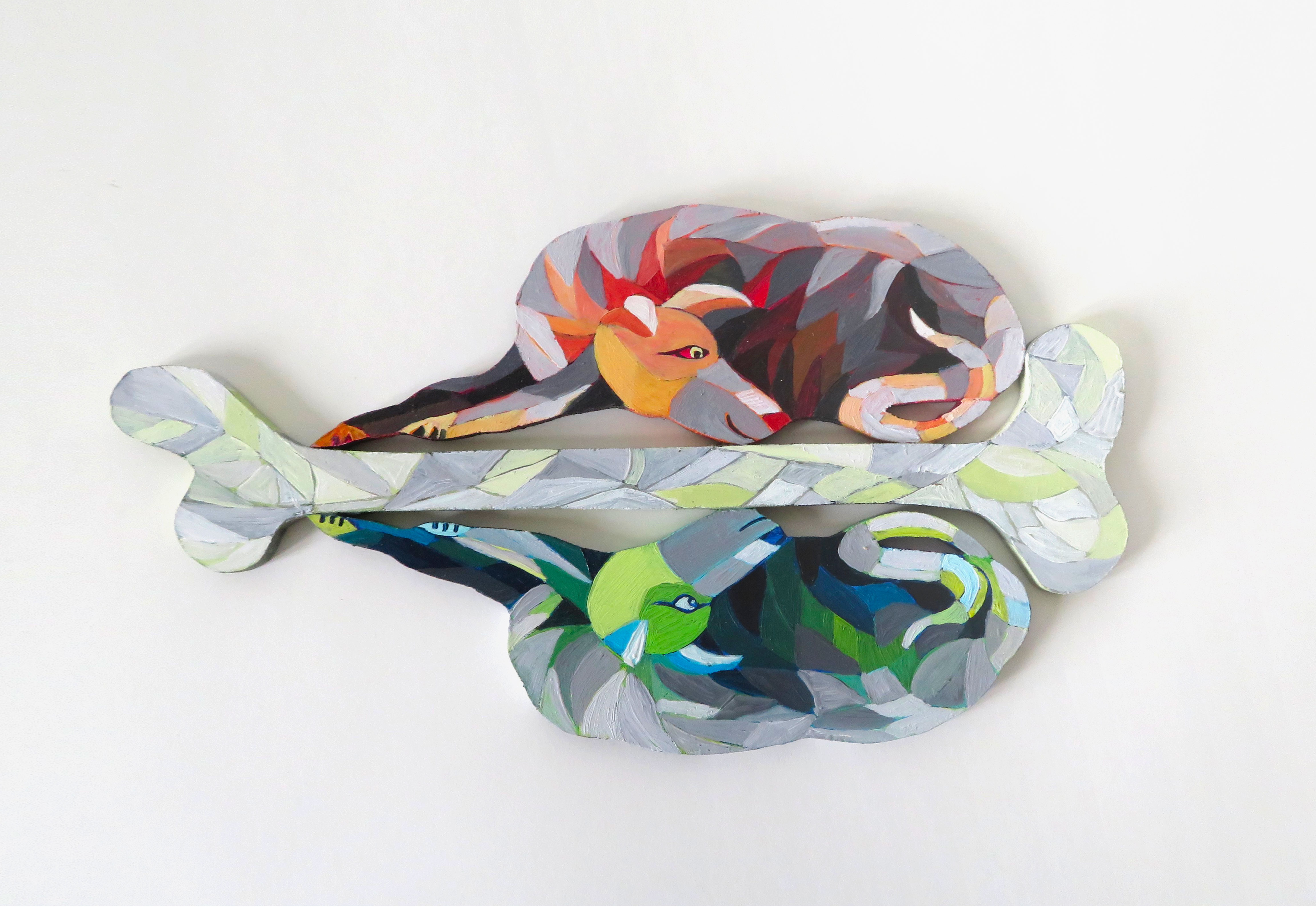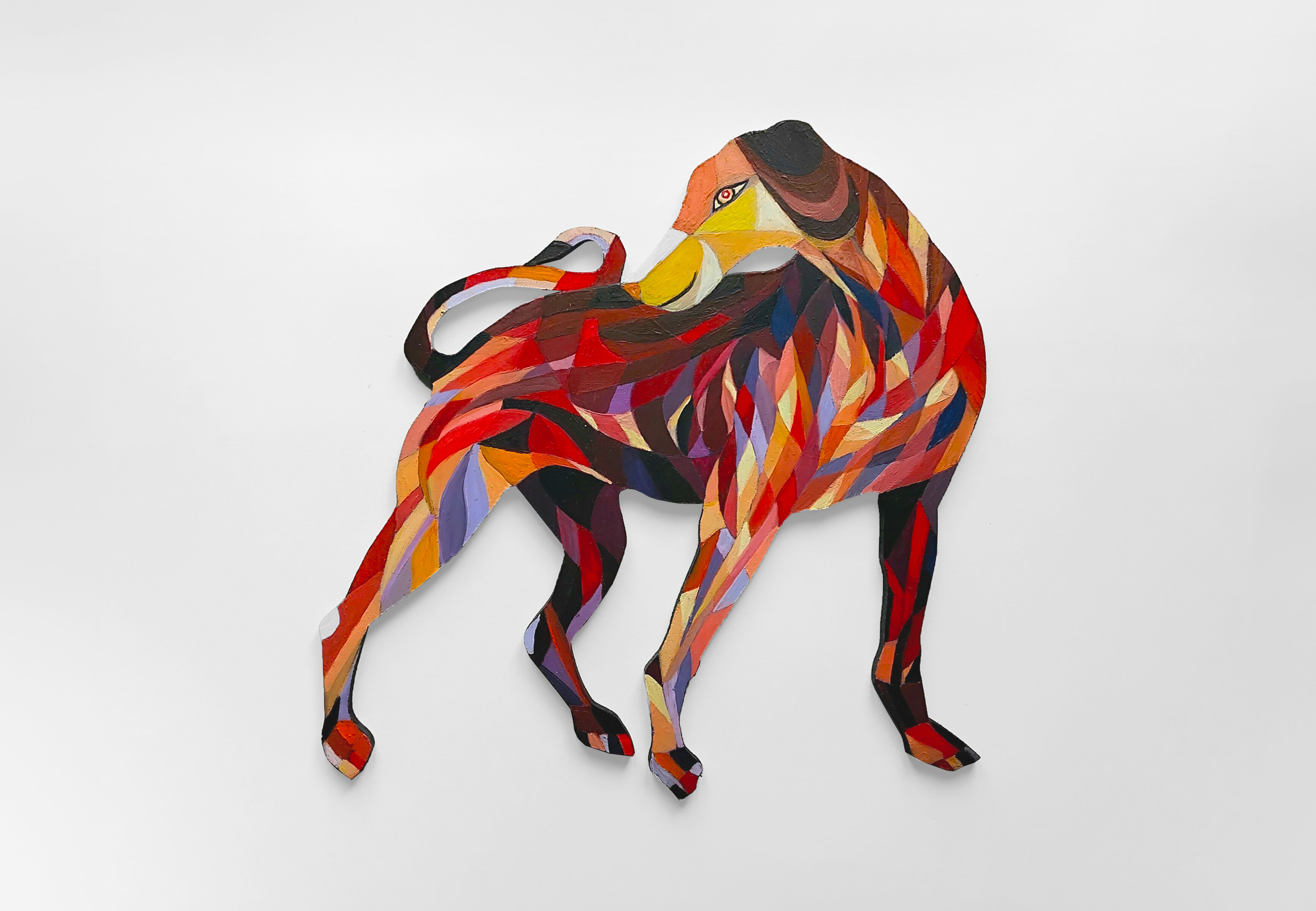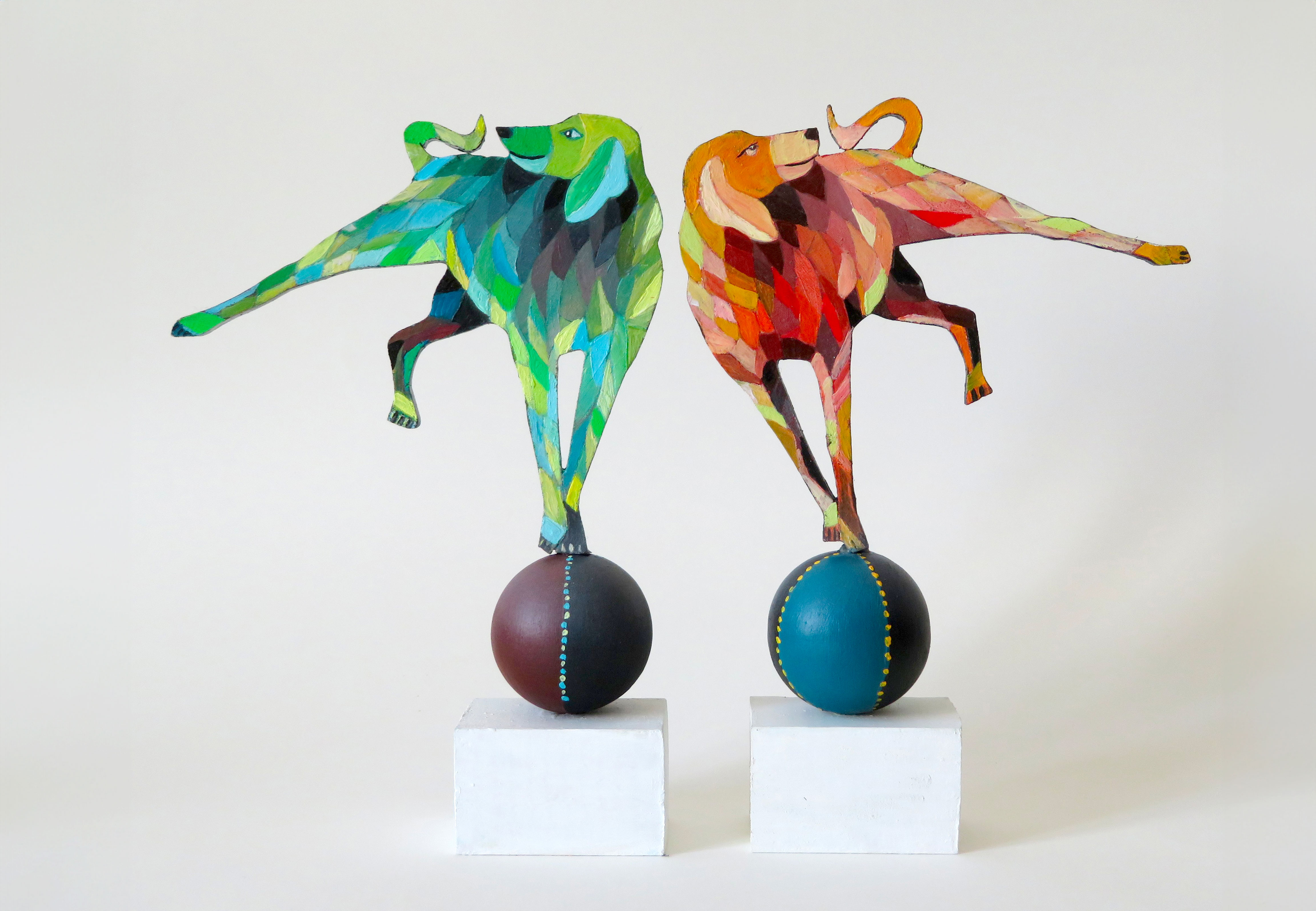 Les chiens à bois d’Alain Saey sont des trésors de vie. Ils courent sur les murs, s’arrêtent, écoutent, attendent, s’ennuient, patientent, s’élancent enfin, s’amusent à deux, boudent, se redressent, s’épaulent. Leurs dos à facette miroitent, dans des gammes de rouge, de bleu, de violacé.