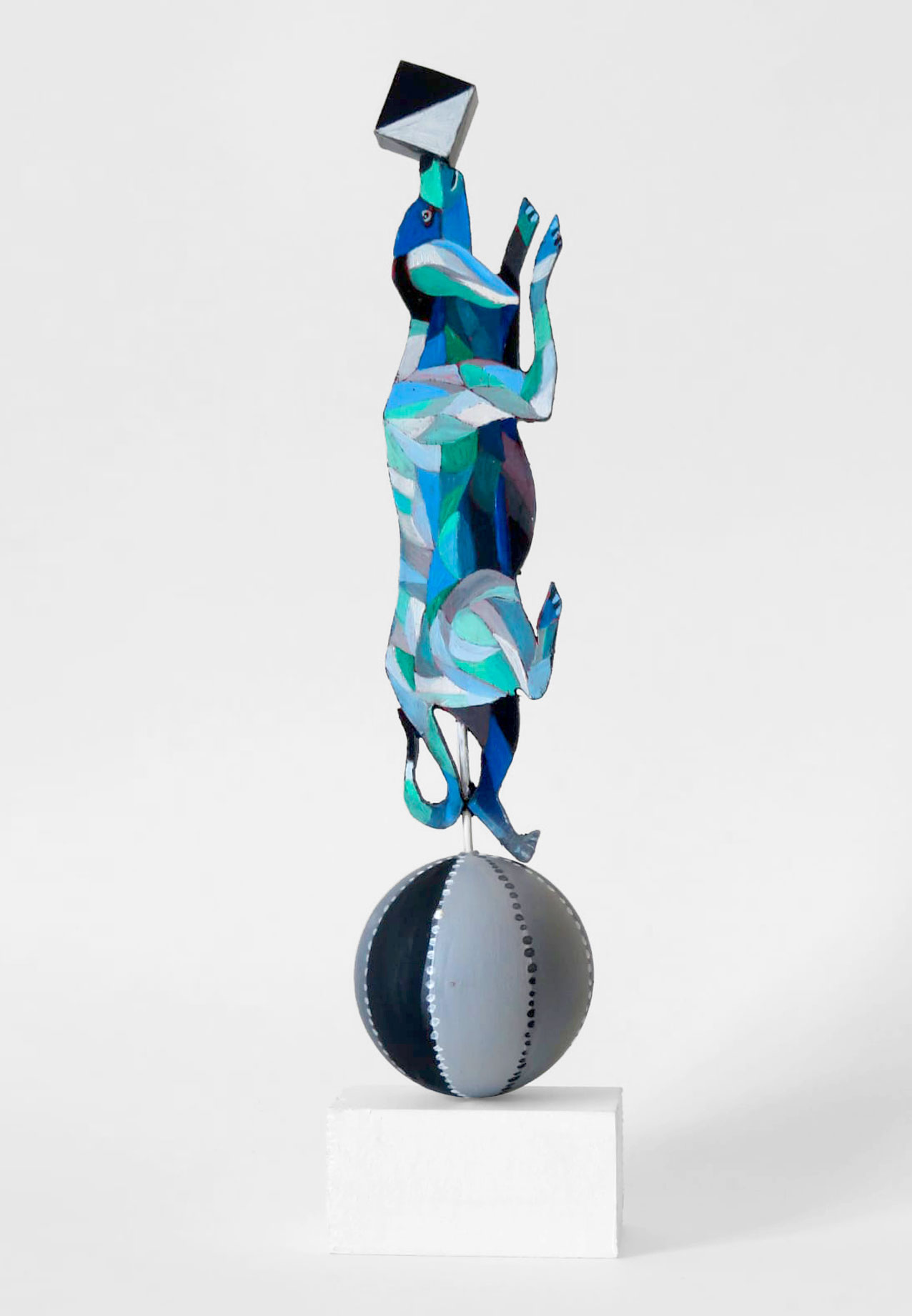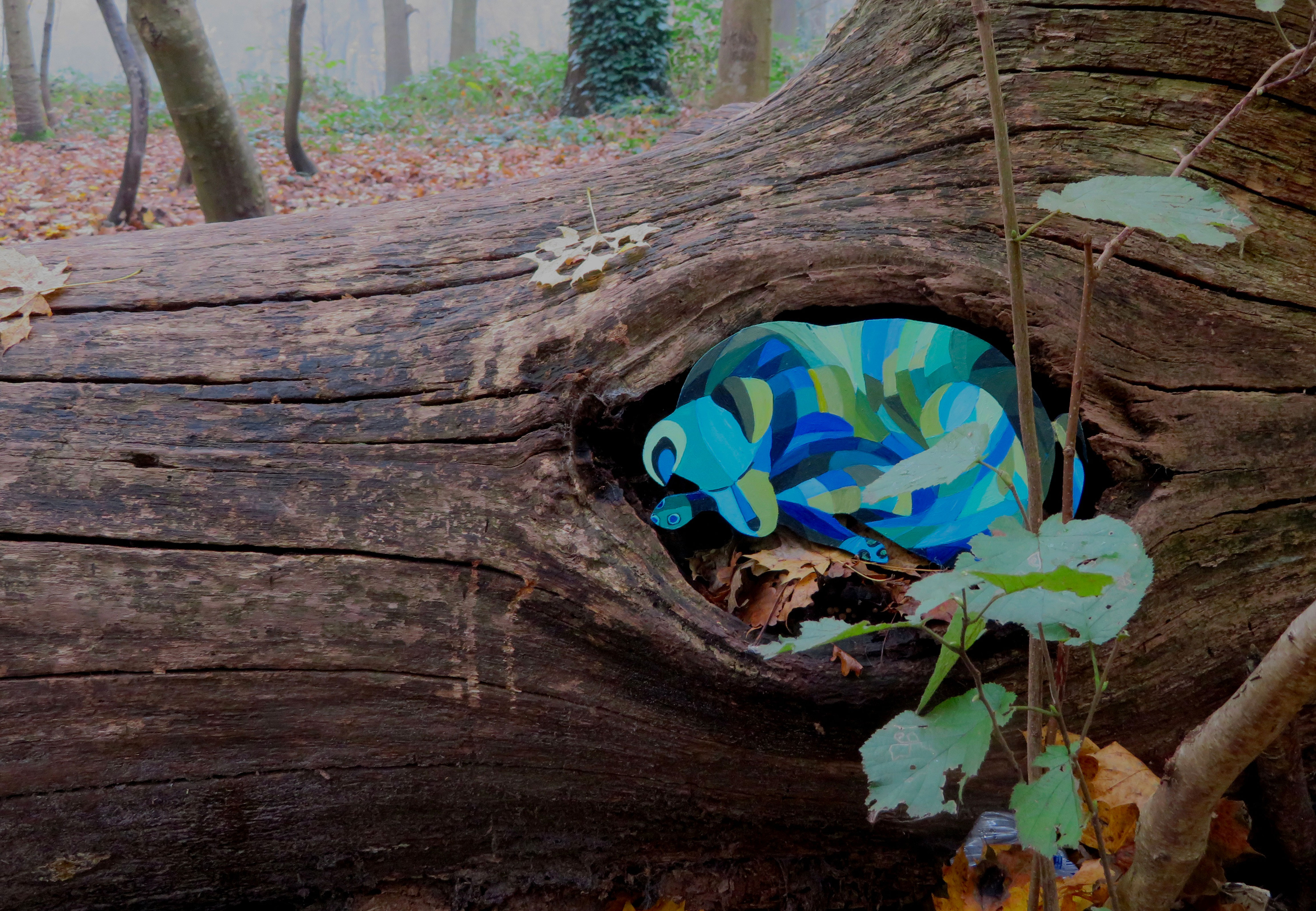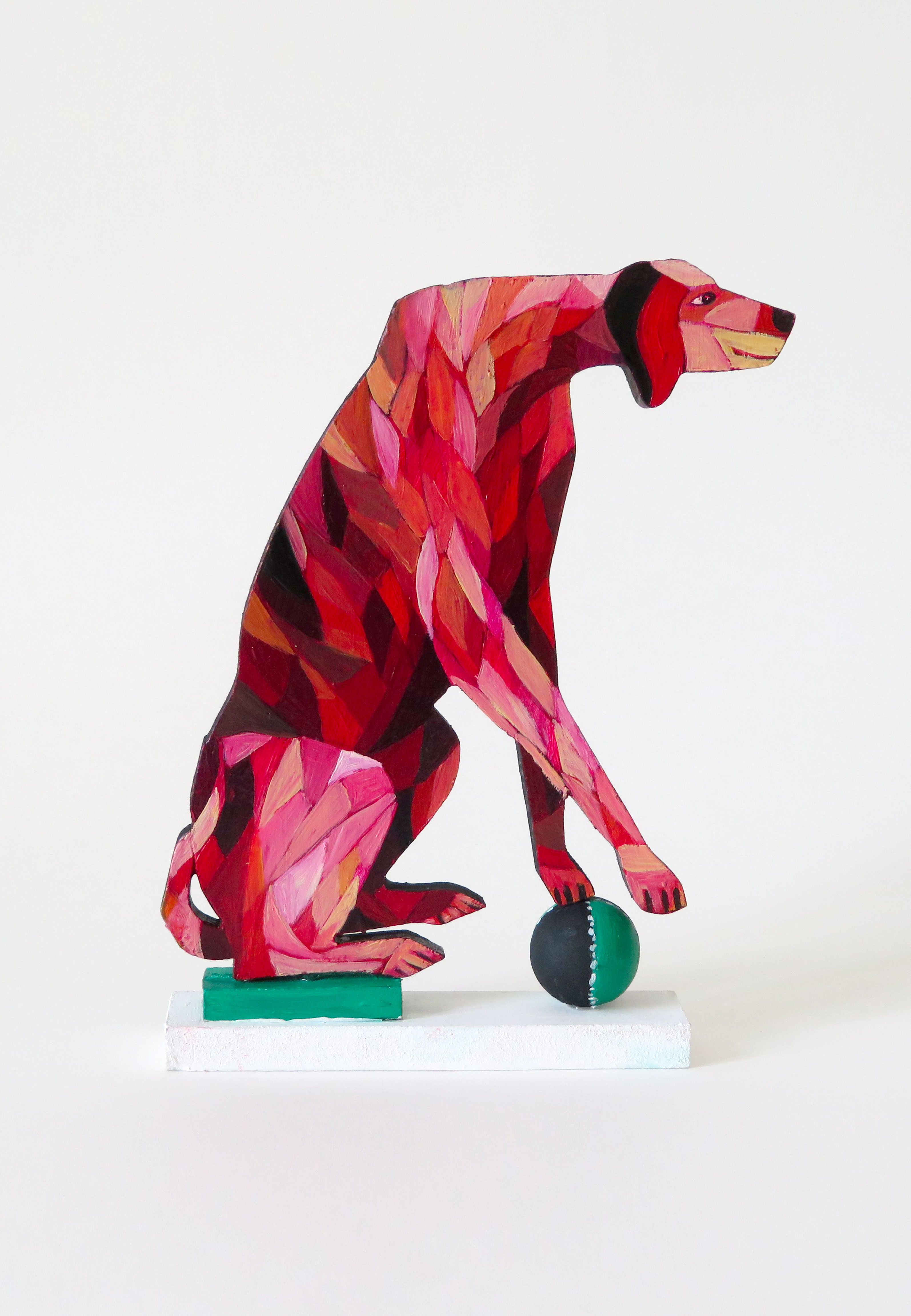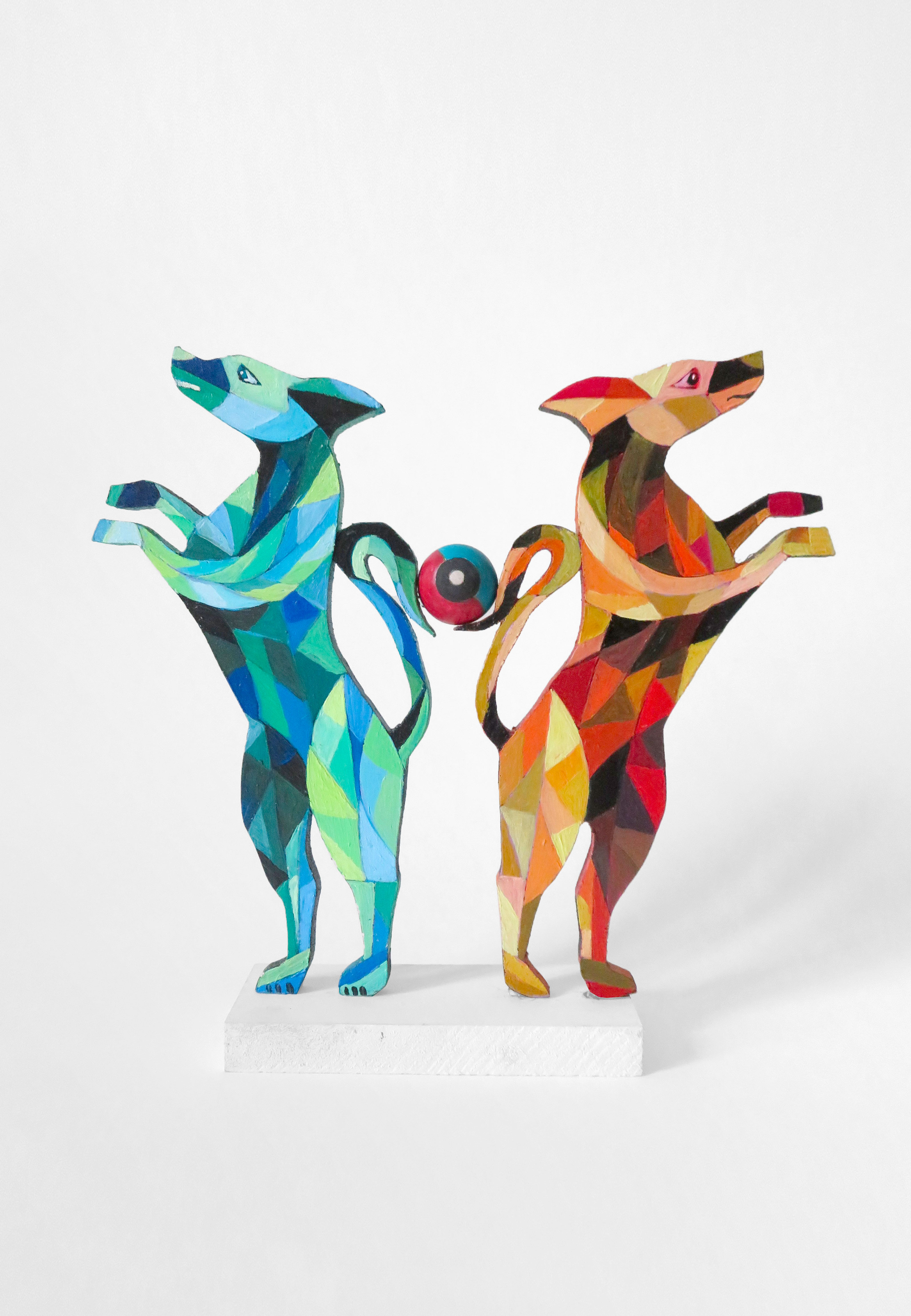Les chiens à bois d’Alain Saey sont des trésors de vie. Ils courent sur les murs, s’arrêtent, écoutent, attendent, s’ennuient, patientent, s’élancent enfin, s’amusent à deux, boudent, se redressent, s’épaulent. Leurs dos à facette miroitent, dans des gammes de rouge, de bleu, de violacé.